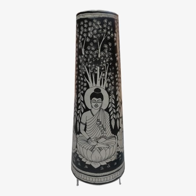 Buddha is an enduring symbol of peace, wisdom, compassion, and inner awakening. His presence represents calmness of mind and spiritual balance. This “Andhra Pradesh Leather Puppetry Buddha Lampshade” is a handcrafted décor piece inspired by the traditional Tholu Bommalata art form. Made from treated natural leather and detailed with hand-painted motifs, the lampshade features a serene image of Buddha seated in meditation.