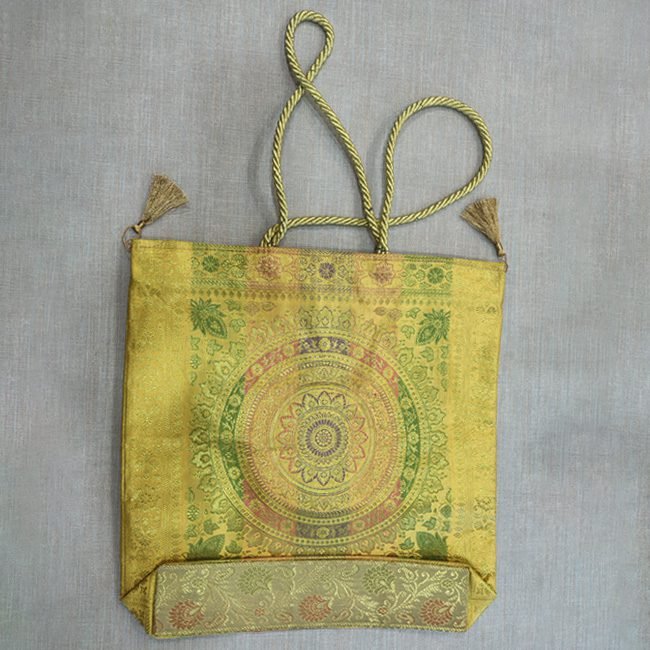 This “Banaras Brocades Golden-Yellow Handbag” is a graceful blend of traditional artistry and everyday functionality. Woven in a warm golden-yellow hue, it features an intricate circular mandala design enriched with delicate floral motifs in soft green and subtle pink tones. The luxurious brocade fabric gives the bag a festive yet refined appeal. It comes with two compartments, a spacious main compartment and a small inner compartment to organize essentials. Both compartments have secure zipper closures.