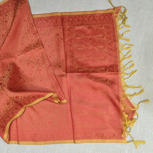This “Banarasi Cotton Silk Stole Orange with Yellow Border “ features paisleys and the subtle allover designs. Deeper shade of orange makes this stole visually stunning and unique, providing definition and visual interest. Prominent paisley motifs, particularly in the border sections showcasing the intricate detail characteristic of Banarasi weaving. The tassels at the ends of the stole are a vibrant golden yellow, adding a cheerful and complementary accent to the warm tones of the stole itself.
