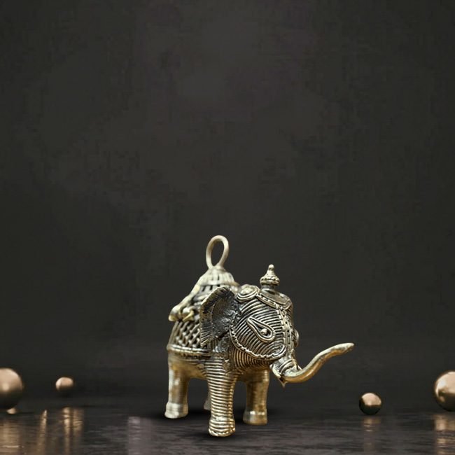 Elevate your decor with this Bengal Dokra Brass Elephant-Shaped Jewellery Box, meticulously handcrafted using the ancient lost-wax casting technique. Featuring signature wire-like patterns and a rustic textured finish, this piece blends traditional artistry with modern functionality. Made from high-quality brass, it serves as a stylish storage solution for jewellery and valuables, while adding an artistic touch to your home or office interior.