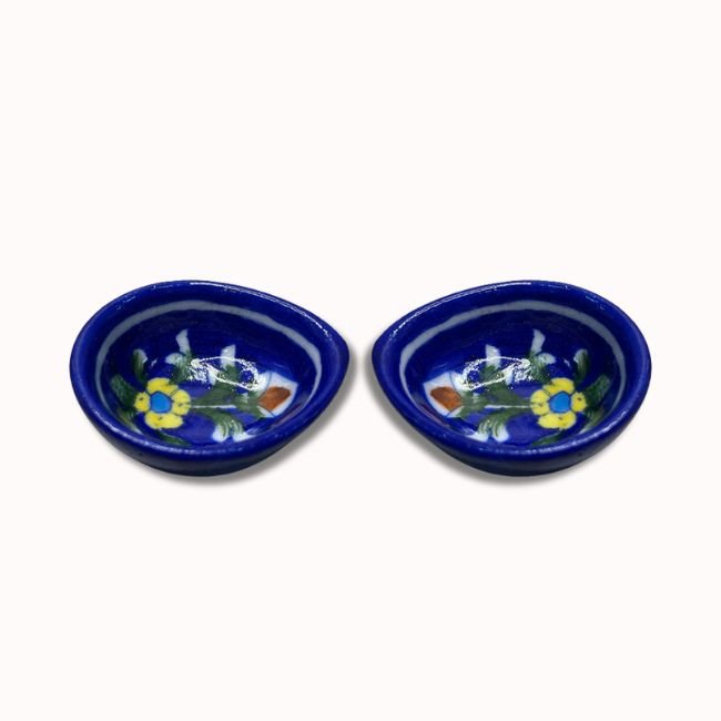 This “Blue Pottery of Jaipur Ceramic Floral Design Diya” features elegant floral design. It is made from a traditional, non-clay dough of quartz stone powder and powdered glass. The interior is painted a vibrant cobalt blue and features a yellow flower with green leaves and brown detailing. The bowl shape is designed to hold oil and a wick, making it a functional oil lamp in the traditional style. It is an example of the unique and intricate hand-painted art form originating from Jaipur, Rajasthan.