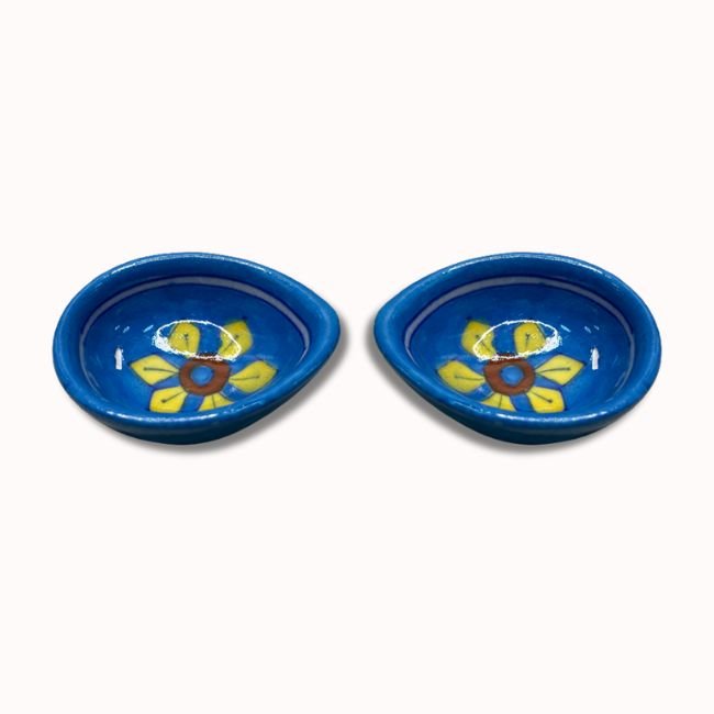 This “Blue Pottery of Jaipur Ceramic Flower Design Diya” is another masterpiece created by Blue Pottery of Jaipur. It is a shallow, bowl-shaped diya made from a unique, low-fired, non-clay material. The interior of the diya is a solid cobalt blue, with a hand-painted design of a single, central yellow flower that has a brown circle in its middle. The exterior is also painted in the same deep blue, and the piece is finished with a smooth, glossy glaze. The hand-painted, floral motif is characteristic of traditional Jaipur blue pottery.