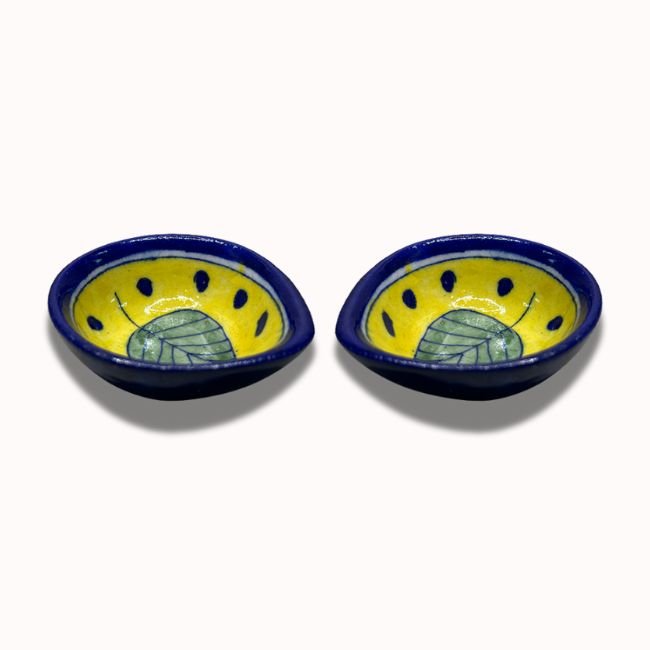 This “Blue Pottery of Jaipur Ceramic Leaf Design Diya (Oil Lamp)” is a handcrafted masterpiece of Jaipur blue pottery. It is made from a special non-clay dough of quartz stone powder, powdered glass, and other materials. The diya features a vibrant yellow base with a prominent green leaf design and blue polka dots, bordered by a dark blue rim. The piece is an example of the traditional art form of Jaipur, Rajasthan, which is known for its intricate hand-painted designs and use of vivid colors like blue, yellow, and green.