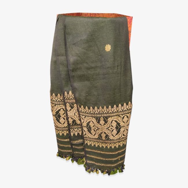 This handwoven “Eri Silk Olive Green Stole” is crafted from pure Eri silk, also known as “Ahimsa Silk,” a sustainable and skin-friendly silk variety native to Assam. Eri silk is valued for its soft warmth, durability, and breathable texture, making it comfortable to wear across seasons. The stole features an elegant, deep olive-green base complemented by intricate golden woven motifs inspired by traditional Assamese patterns. The decorative border showcases floral and geometric designs, while the tiny gold buta on the body adds a subtle highlight.