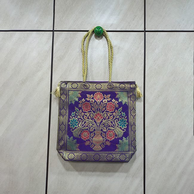 This “Floral Kalash Design Banarasi Bag” is set against a deep royal purple base, the bag features an exquisite floral kalash motif woven in shimmering zari, symbolizing prosperity, abundance, and tradition. Its borders are inspired by classic Banaras patterns that frame the design. Structured yet lightweight, this bag is perfect for carrying essentials during weddings, festivals, poojas, and cultural gatherings.