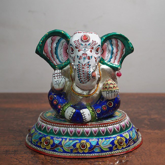 This exquisite “Ganesh Ji Gulabi Meenakari idol” is a handcrafted masterpiece created by skilled Meenakari artisans of Banaras, reflecting the city’s rich heritage of fine enamel artistry. Beautifully adorned with intricate floral motifs, vibrant enamel colors, and detailed hand-painting, the idol showcases Lord Ganesha in a serene seated posture, symbolizing wisdom, prosperity, and protection. Perfect for home temples, festive décor, gifting, or spiritual spaces.