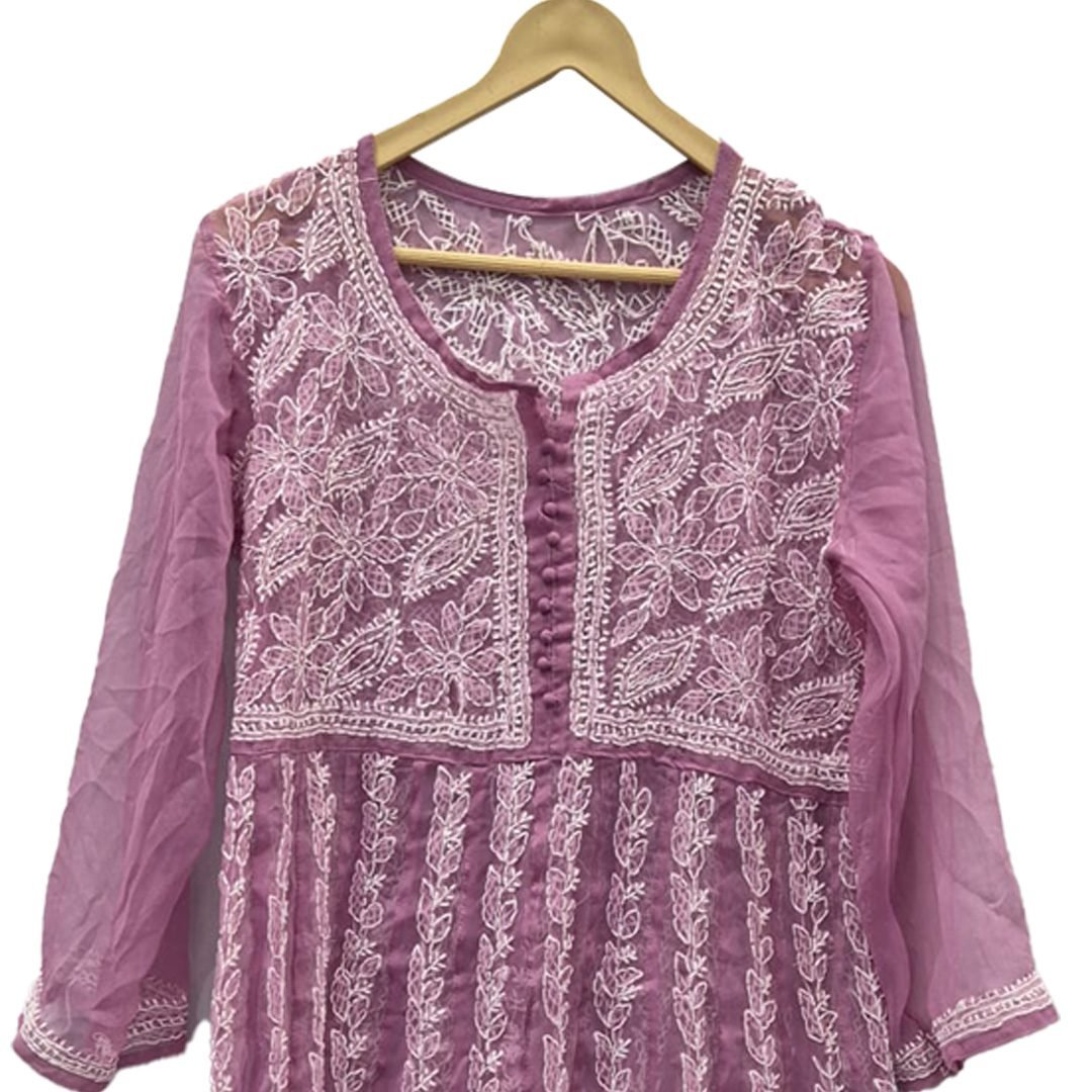 The graceful lavender shade of this “Lucknow Chikan Craft Anarkali Kurta Lavender” looks very elegant and classy. Crafted from soft chiffon fabric, it offers a flowing, lightweight drape that flatters every silhouette. Made using premium anchor thread, and adorned with intricate floral embroidery and dainty fabric buttons. A perfect fusion of cultural artistry and modern grace for your ethnic wardrobe.