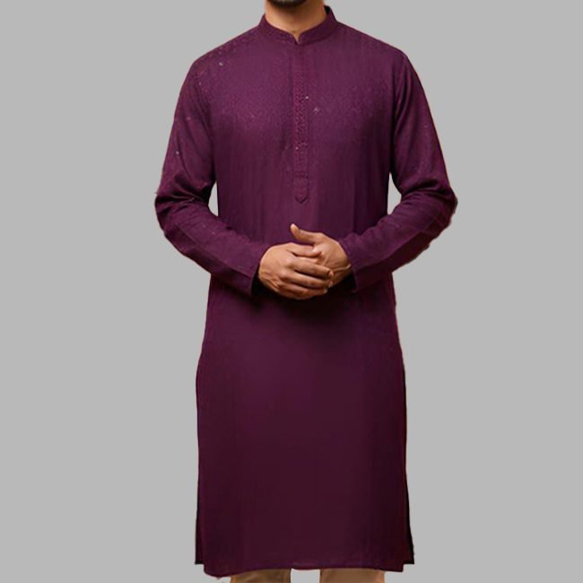 This “Lucknow Chikankari Embroidered Purple Kurta” makes a bold yet elegant statement with its deep, festive hue and clean, graceful silhouette. Made from soft rayon fabric, it offers a smooth, lightweight feel that keeps you comfortable while maintaining a polished look. The kurta is enhanced with fine hakoba detailing and subtle sequin work on the front, adding a touch of understated sparkle.