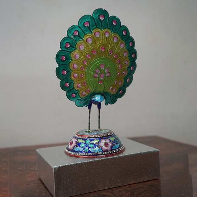 This “Meenakari Work Dancing Peacock Showpiece” is a finely handcrafted decorative piece that celebrates the elegance of traditional Indian enamel art. Crafted by skilled artisans, it features a graceful peacock with a fully fanned tail, adorned in vibrant blue, green, and gulabi hues with intricate floral and paisley detailing. The glossy Meenakari finish, delicate metalwork, and ornamented base reflect meticulous craftsmanship and cultural richness. Symbolizing beauty, joy, and prosperity, this showpiece is perfect for home décor, festive displays, office spaces.