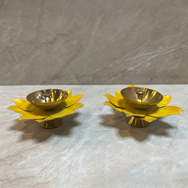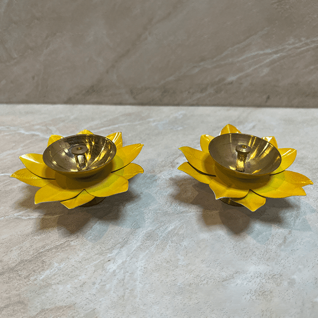 Bright as flames, this “Moradabad Metal Craft Brass Lotus Diya Yellow” captures the beauty of light and devotion in its elegant design. Handcrafted by Moradabad’s master metal artisans, it reflects their timeless skill and attention to detail. Made from pure brass, this diya features a radiant yellow lotus base that symbolizes purity, hope, and positivity. Its golden bowl gleams beautifully when lit, creating a warm and festive ambiance. Perfect for Diwali, daily puja, or as a decorative piece.