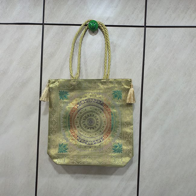 This “Motif Design Banarasi Bag, a graceful expression of India’s rich textile heritage. Woven in luxurious Banarasi brocade, the bag features a traditional circular motif highlighted with intricate zari work that reflects the finesse of Banaras weaving traditions. Designed with twisted rope handles for ease and elegance, and finished with delicate side tassels,it features two compartments, a spacious main compartment, and a small inner compartment, both secured with zipper closures.