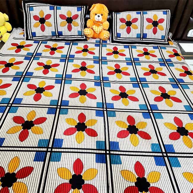 This “Pilkhuwa Hand Block Print Colorful Floral Motifs Bedsheet” is crafted from soft and breathable cotton. Created by skilled artisans of Pilkhuwa, this bedsheet showcases colorful floral motifs arranged in a neat grid pattern with bright red, yellow, and blue tones that create a lively and refreshing look. The matching pillow covers complement the bedsheet beautifully, enhancing the overall appeal of your bedding.