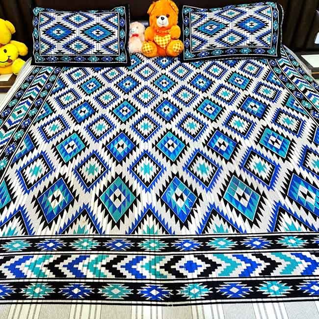 Created by skilled artisans using traditional hand-carved wooden blocks, this “Pilkhuwa Hand Block Print Diamond Pattern Bedsheet” reflects the rich heritage of Pilkhuwa’s famous hand block printing craft. The design features striking geometric diamond patterns in shades of blue, teal, and black, arranged in a rhythmic layout that adds depth and elegance to the overall look. The detailed border and matching pillow covers complement the bedsheet perfectly. Comfortable, durable, and visually appealing, this handcrafted bedsheet is perfect for everyday use while bringing a touch of traditional artistry into your home.