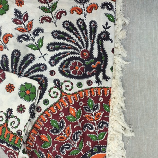 This “Pilkhuwa Hand Block Print Textile Graceful Peacock and Floral Design Bedsheet with 2 Pillow Covers” is perfect to transform your bedroom into a haven of comfort and artistry. It showcases the beauty of hand block printing by skilled craftsmen from Pilkhuwa (Uttar Pradesh). It features a graceful peacock design with elegant floral prints. Made from high-quality cotton fabric, it is durable for long-term use.