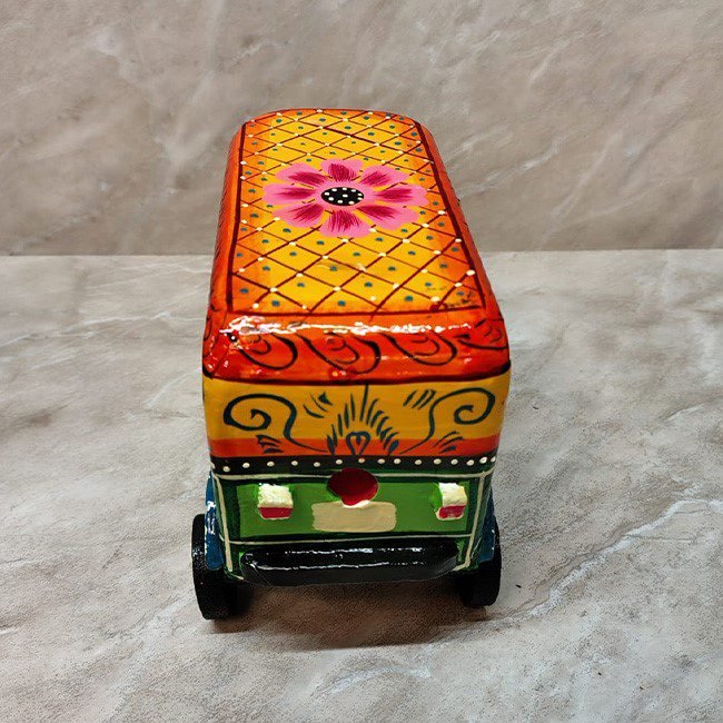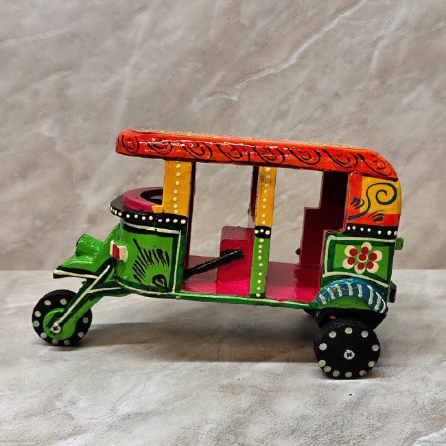 This “Varanasi Wooden Auto Rickshaw” is a handcrafted traditional toy showcasing India’s rich cultural heritage. It is made by skilled artisans in Varanasi using high-quality wood and finished with vibrant, intricate hand-painted designs. It features a yellow and green color scheme, which is a very popular color for Auto Rickshaw in cities like Delhi, Bengaluru, and various parts of Uttar Pradesh. It has rotating wheels, suitable as a playful toy for children or as a charming decorative showpiece for homes and offices.