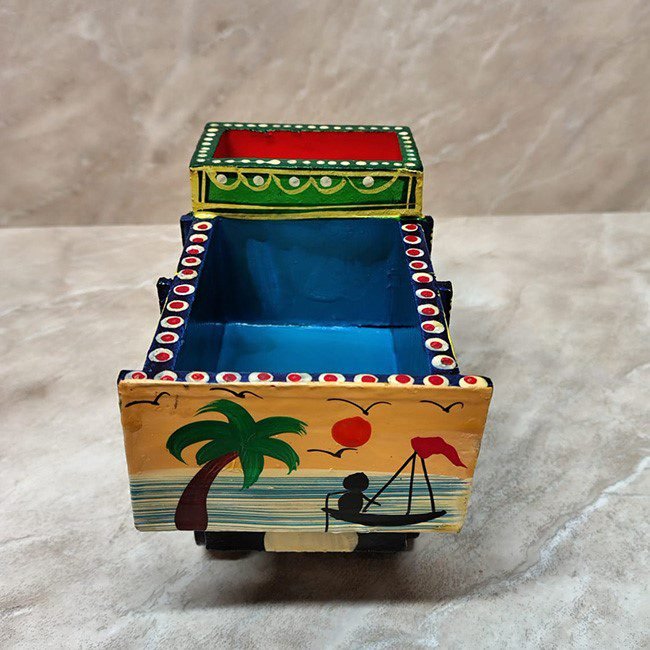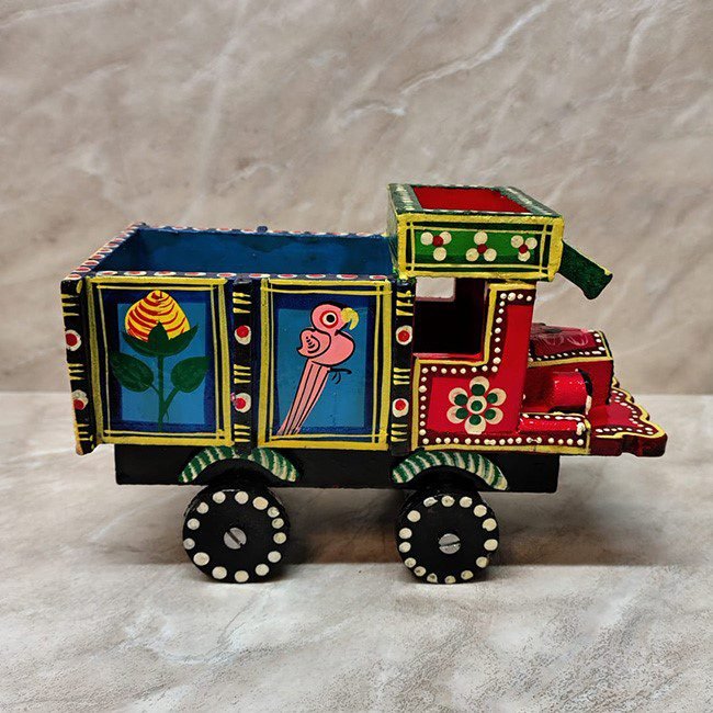 This handcrafted “Varanasi Wooden Truck” beautifully showcases the art found in our everyday transport. Handcrafted and hand-painted by skilled artisans from Varanasi, it is inspired by Indian trucks seen on roads across the country. It is made of premium wood (Sheesham) and is finished with bright, non-toxic lacquer or oil paints. Its movable wheels make it a playful toy for children, and its vibrant design makes it a perfect decorative piece.